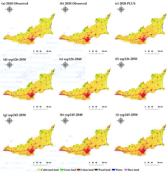 Figure 6 and Table 5 show the predicted results and the number of LULC types for the different scenarios. The area occupied by cultivated land is always higher, while urban land, water bodies, woodland, and grassland are lower, and bare land is always at the lowest level. In the SSP126 scenario, from 2030 to 2050, all land types show an increasing trend except for urban land, which decreases by 6.9% year on year. In contrast, urban land increases by 4.1% from 2030 to 2040 and by 2.6% from 2040 to 2050. Overall, it shows an upward trend and a slower growth rate. In contrast to the SSP126 scenario, urban land under the SSP245 scenario maintains a higher growth rate from 2030 to 2050, increasing by 18.4% year on year, with all other land types showing a decreasing trend.