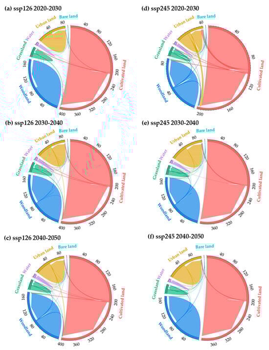 Under different scenarios, there is a wide range of future land-use changes. The SSP126 scenario, except for cultivated land, maintains an increasing trend, with woodland and grassland showing fluctuating growth trends and with cultivated land consistently shifting to woodland, urban land, and water bodies; the SSP245 scenario, except for urban land, maintains a decreasing trend, with cultivated land and other land types mainly shifting to urban land, leading to a large increase.