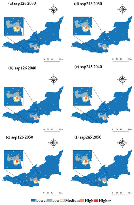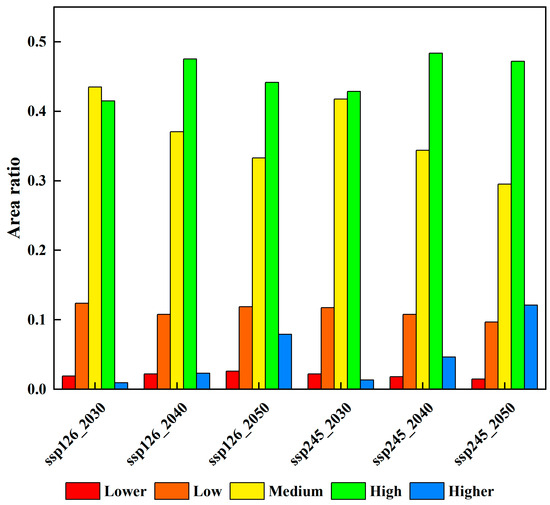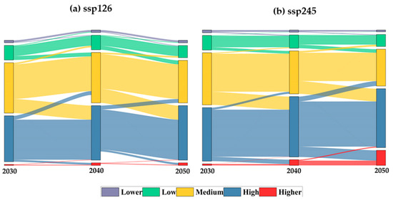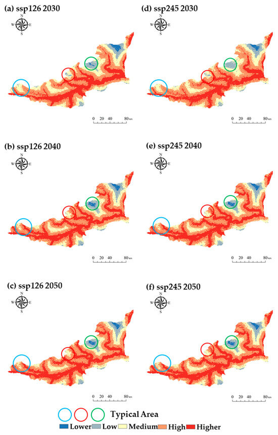 The spatial distribution of the environmental sensitivity to flooding in the Guanzhong Plain between 2030 and 2050 is shown in Figure 10. The spatial distribution of the sensitivity to flood hazards in the Guanzhong Plain can be analyzed from this. To better analyze the changes, three typical areas of change are selected for analysis; when coupled with Figure 11, it can be seen that the green area mainly represents the variation in low-risk areas, which remains around 0.06 for all years, except for the SSP245 scenario, where it is 0.03 in 2030. The red areas mainly show the change from low-risk areas to medium- and high-risk areas, and the blue areas mainly show the transition from medium-risk areas to high- and higher-risk areas. As we set the distance from the river to remain constant, the changes in this part are mainly influenced by land use. Combined with Figure 6, it can be seen that there is a more obvious expansion of urban land in this area. Under the SSP245 scenario, the high- and higher-risk areas in 2050 account for more than 30%, with the higher-risk area reaching 38.9%, so the area’s risk level is significantly higher.