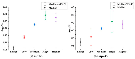 This study primarily considers flood vulnerability regarding demographic and socioeconomic factors. On this basis, the Jenks methodology is used to classify the risk levels into five, which are lower, low, medium, high, and higher. Most of the medium–higher vulnerable areas are mainly located in urban land areas. Most areas have low vegetation cover but are densely populated and more economically developed, which has been shown to play a somewhat important role in increasing vulnerability. The areas of low vulnerability are mainly located in agricultural areas, and most are flat. As seen in Figure 12, there is little change in the vulnerability between the two scenarios, mainly in the form of a decrease in the lower-risk areas and an increase in the medium-to-higher-risk areas.
