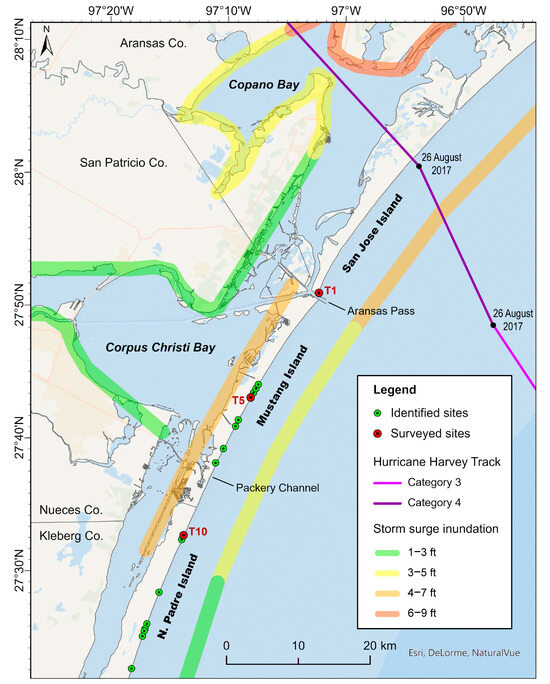 Study area of the central Texas coast, covering San Jose, Mustang, and North Padre Islands. Green points indicate >100 m long sections along the shore with over 1 m vertical erosion in the foredunes. Red points are the sites selected for UAV surveying. The Hurricane Harvey track was downloaded from the NOAA National Hurricane Center [32]. Storm surge inundation levels (in feet above ground) are from Blake and Zelinsky [31].