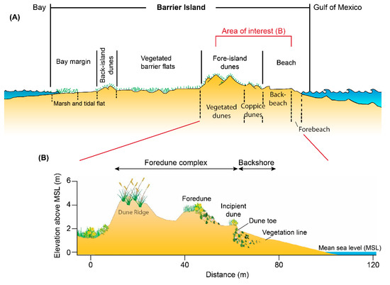 Description of barrier islands on the Texas Gulf Coast. (A) Generalized environments and geomorphological features observed on a barrier island (modified after [35]). (B) Detail of a foredune−backshore complex on an unmaintained beach (modified after [33]).