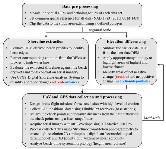 The workflow of this project is summarized in Figure 3. First, all data sets were imported into an ArcGIS Pro [38] project. Then, individual digital-elevation-model (DEM) and orthophoto tiles were combined into single raster products and projected to a common spatial reference (North American Datum [NAD] 1983 [2011], Universal Transverse Mercator [UTM] Zone 14N). Next, a study-area polygon was defined, and all products were clipped to this polygon to ensure equal coverage among the data from different years. Following pre-processing, shoreline change analysis and elevation differencing were performed as described in the subsequent methodology sections.