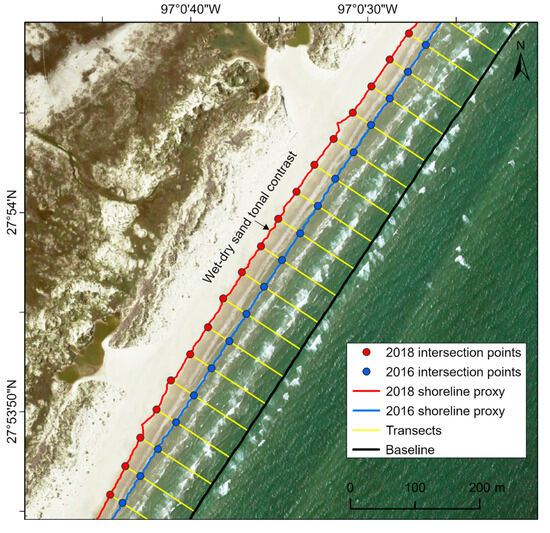 Finally, the USGS Digital Shoreline Analysis System (DSAS version 5.1) [41] was used to compute change statistics between the 2016 and 2018 shorelines. First, a shore-parallel baseline was defined 100 m offshore, and shore-perpendicular transects were cast from this baseline to the 2016 and 2018 shoreline proxies at a 50 m spacing along the shore (Figure 4). Each shoreline must have a positional uncertainty assigned to it to account for shoreline variation due to natural influences, such as waves, tides, and winds, as well as shoreline variation due to measurement uncertainties [41]. A 10 m positional and measurement uncertainty was assigned to the shorelines based on the lateral shift associated with the vertical accuracy of the DEMs (Table 1), the slope of the beach, and the range of shoreline proxy elevations. This value is also the default, average shoreline uncertainty value suggested by the USGS [41]. Then, the distances in meters from the baseline to the intersection-point pairs were used to calculate the net shoreline movement (NSM) at each transect. The end point rate (i.e., the shoreline movement rate expressed in m/yr) was calculated by dividing the NSM by the time interval between the two shoreline proxies. It is important to note that this time interval represents a short-term change within 18 months; therefore, the average movement rates expressed in m/yr should not be projected into the future as trends and should only be used as a unit to express the effect of the hurricane and to compare to average retreat rate of the Texas coast.