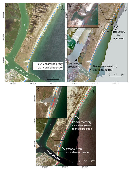Comparison of pre- and post-Harvey aerial imagery. (A) 30 September 2016, NAIP imagery, showing the 2016 shoreline proxy in blue. (B) 28–30 August 2017, Harvey Response imagery, showing detail of breached dunes and overwash areas. (C) 17 May 2018, NAIP imagery showing the 2018 shoreline proxy in red and the 2016 shoreline proxy in blue, as well as a detail of a washout fan at the southern tip of San Jose Island.