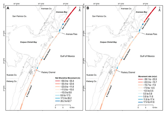 A statistical summary of the shoreline change rates is shown in Table 3. Almost 90% of the central Texas coast was erosional, with an average retreat of 16.2 m (10.7 m/yr). Almost a quarter of the shore experienced statistically significant levels of erosion (i.e., the percentage of all transects that have a negative rate that has a larger magnitude than the uncertainty [41]), such as the maximum retreat of 69 m at San Jose Island due to the impact of Hurricane Harvey. Accretional transects, found adjacent to jetties, comprised a small portion (12.3%) of the coast, and only one-third of these sections experienced significant accretion (i.e., the washout fan on the southern tip of San Jose Island that caused the maximum shoreline advance of 62.7 m). Finally, the net movement of the shoreline after the passing of Hurricane Harvey (between 2016 and 2018) averaged at a retreat of 12.6 m and a rate of 8.3 m/yr.
