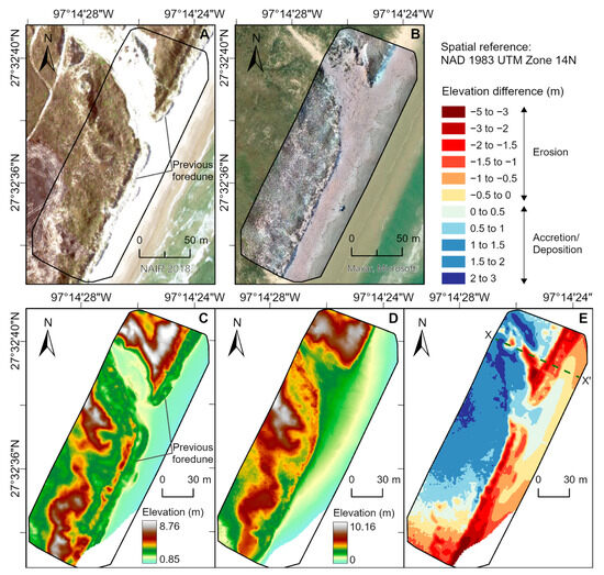Changes in the beach−foredune complex of site T10 on North Padre Island. (A) 17 May 2018, NAIP imagery. (B) 11 May 2022, orthophoto, overlain on World Imagery basemap (22 January 2023). (C) March 2018 digital elevation model. (D) May 2022 digital terrain model. (E) Elevation difference map showing areas of erosion and accretion or deposition.
