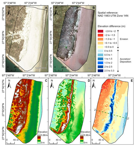 Changes in the beach−foredune complex of site T1 on San Jose Island. (A) 17 May 2018, NAIP imagery. (B) 16 May 2022, orthophoto, overlain on World Imagery basemap (22 January 2023). (C) March 2018 digital elevation model. (D) May 2022 digital terrain model. (E) Elevation difference map showing areas of erosion and accretion or deposition.