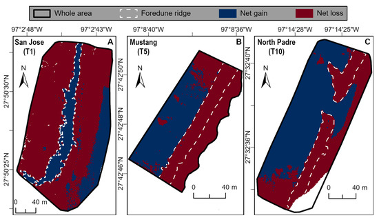 The calculated volume of sediment change on the primary foredune at each site is as follows: 3310 m3 of net sediment erosion at site T5 on Mustang Island; 6151 m3 of net sediment erosion at site T10 on North Padre Island; and 6502 m3 of net sediment accretion at site T1 on San Jose Island (Table 4).