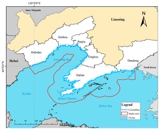 Liaoning Province is the northernmost coastal province in China, bordering the Bohai Sea and the Yellow Sea to the south. It experiences a temperate monsoon climate and is situated between 118°53′ to 125°46′E and 38°43′ to 43°26′N, as shown in Figure 1. The coastline of Liaoning Province stretches from the mouth of the Yalu River in the east to the boundary with Hebei Province in the west, spanning five different latitudes from north to south. The coastline is characterized by its winding and intricate nature, featuring diverse geological types. Numerous rivers flow into the sea along the coast, enriching the area with nutrients. This has given rise to two major marine ecosystems, the northern Yellow Sea and the Liaodong Bay, which are significant for fisheries production in the region []. In recent years, influenced by market demand and policies, the mariculture areas of various scales in Liaoning Province have shown a growing trend []. The growth rate of mariculture production and the expansion rate of mariculture ponds in Liaoning also rank among the highest in China’s coastal provinces [].