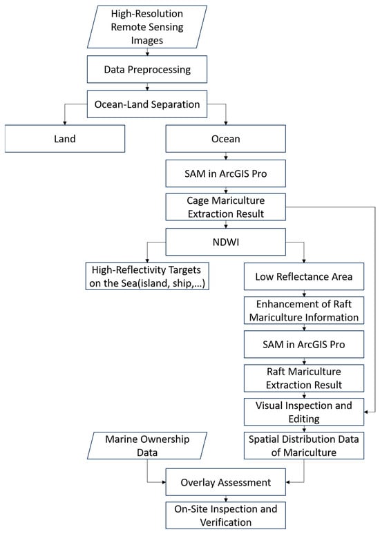 The overall methodology employed in this study is illustrated in Figure 2. High-resolution remote sensing images undergo preprocessing, including radiometric calibration, geometric correction, and image fusion. Land and water separation is achieved based on continental vector data and the Normalized Difference Water Index (NDWI) to remove land areas and reduce interference in the extraction of mariculture. For the ocean areas, the first step involves using SAM to extract the more prominent cage mariculture. Then, for the weaker information associated with raft mariculture, after further using NDWI to remove small islands, vessels, and cage mariculture in the sea, brightness stretching is applied to the raft mariculture areas to enhance the information. SAM is then employed for extraction. The results are subsequently visually inspected, modified, and supplemented to obtain the final spatial distribution data of mariculture. These results are overlaid with maritime ownership data, and an overall assessment of the distribution of mariculture is conducted.