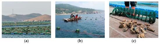 Field inspection photos. (a) Cage mariculture; (b) alga raft mariculture (kelp); (c) bivalve raft mariculture (hanging cages).