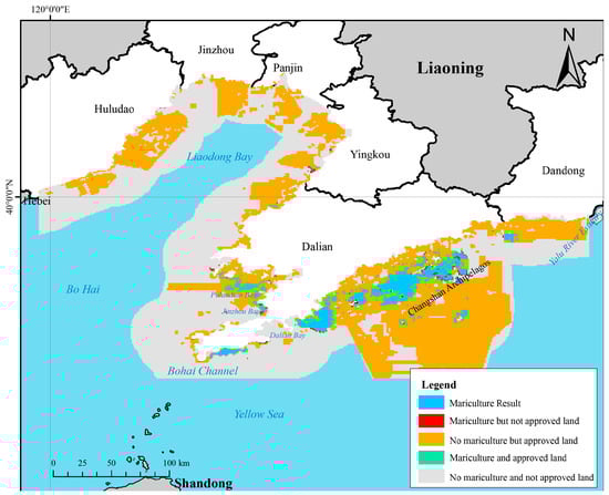In Figure 5, there is still a significant area within the planned mariculture zone where mariculture activities have not been observed. It is highly likely that this portion of the area is used for bottom culture mariculture. The spatial distribution of bottom culture mariculture cannot be accurately determined through remote sensing methods. However, according to the Fisheries Statistical Yearbook [], bottom culture mariculture accounts for approximately 70% of the mariculture in Liaoning Province. In this study, the “approved but not cultivated” areas make up 87.7% of the overall approved mariculture zones, indicating that a significant portion of these areas are indeed designated for bottom culture mariculture.