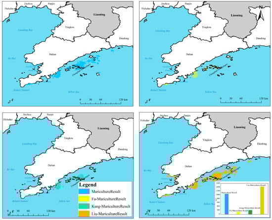 Based on the technical process described in this article, the mariculture in Liaoning Province’s coastal zone was extracted, and the extraction results are shown in Figure 4.