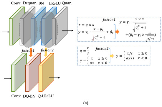 When adopting the mixed-precision quantization mentioned in [45], an inverse quantization layer and a quantization layer are added to the existing neural network structure. Inspired by our previous work [12], this study fuses the inverse dequantization layer with the BN layer. It simplifies them into one multiplication and addition operation, referred to as the DQ-BN layer. Similarly, the fusion of the leaky ReLU with the quantization layer is termed the Q-LReLU layer. The fusion is depicted in Figure 4a.