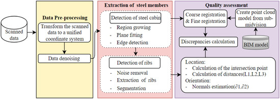 Geometric dimension consistency control technology based on the Scan-vs-BIM system was applied to assess whether the geometric quality of the steel cabin conformed to the design requirements [32]. The technology involves three main steps: (1) data format conversion, (2) coarse registration and fine registration, and (3) the calculation of the deviation. These steps are further explained in Section 4.1.1, Section 4.1.2 and Section 4.1.3, respectively.