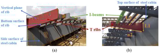 Steel box girders (SBGs) are widely used in the urban overpasses and other large civil infrastructures. Compared with cast-in-place reinforced concrete bridges, SBG bridges have the advantages of a fast construction speed, a light weight, excellent seismic performance, and less building pollution [1]. The structural integrity of SBGs depends on the correctness of the components’ orientation and dimensions, especially the relative location between adjacent components. As for the cantilever beam of an SBG, T ribs play an important role in bearing the vertical load and ensuring stability. If the location and orientation of the T ribs after welding and installation do not conform to the design requirements, the welds between the T ribs and the steel cabin are prone to cracks and may necessitate reworking [2]. Therefore, the location and orientation of the T ribs of the cantilever beam must be consistent with the blueprints during the welding and installation. Once the SBG components are transported to the construction site and the concrete pouring is completed, incorrect SBG component dimensions and locations can result in incalculable economic losses and even fatalities.