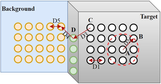 As shown in Table 1, DBSCAN requires two parameters, ε and MinPts, which represent the minimum number of neighborhood points and the threshold of neighborhood distance, respectively. The selection of the MinPts value has a great impact on the clustering results. If MinPts is too small, some mixed pixels may be considered as boundary points and will not be used for the further expansion of the class. When the value is too large, some mixed pixels may not be removed due to the increase in the number of neighborhood points. As shown in Figure 3, assuming that the points of the measured object were evenly distributed, the black hollow points are the valid points on the target object, the green points are the mixed-pixel points, and the yellow points are the background points. When horizontal or vertical, the minimum distance between two valid neighborhood points is , and when in the diagonal direction, the maximum distance between two valid neighborhood points is . The distance between the valid points and the mixed-pixel points, between the mixed-pixel points and the background points, and between the background points themselves are , , and , respectively, which satisfy < < , > . The maximum distance between adjacent valid points is , so the parameter ε of DBSCAN should be greater than ; considering the safety factor, the parameter ε is 1.2. Since > 1.2, point D was not density-reachable at point A and was not included in this cluster. Then, the final background points and valid points were clustered into two clusters, and the mixed pixels were marked as noise.
