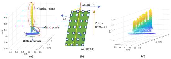 The individual T rib extracted in the last step was composed of two mutually perpendicular planes. However, the vertical plane of the T rib was not complete and contained numerous mixed pixels due to the occlusion of the bottom surface during scanning, as shown in Figure 6a. Therefore, the mixed pixels that were mistakenly detected as a plane between the vertical plane and the bottom plane needed to be removed. According to the spatial position relationship between the mixed pixels and the two perpendicular planes, a denoising algorithm based on the angle between the z-axis and the normal vector was proposed to remove the mixed pixels. The angles between the normal vector and the z-axis of the bottom plane and vertical plane point clouds were close to 0 and 90 degrees, respectively. Nevertheless, the angle between the normal vector of the mixed pixels and the z-axis was about 60 degrees after angle measurement, as shown in Figure 6b. If the angle was within the threshold, the points would be recognized as mixed pixels and removed (Figure 6c).