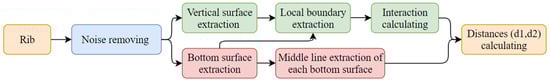 After extracting the intersection, the last step was to calculate the distances. As shown in Figure 10a, d1 is the distance from the intersection point to the upper boundary extracted in Section 3.2.3. The distance (d2) between adjacent T ribs should also be consistent with the design requirements. The median line of the bottom surface of one T rib was fitted by least squares. Then, the distance between the center points on another T rib and the fitted line was calculated, and the average distance (d2) was obtained, as shown in Figure 10b.