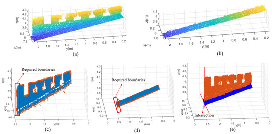 Since part of the point-cloud data was missing due to the occlusion, the bottom and vertical surfaces of the T rib were completely separated, as shown in Figure 9c. Therefore, the bottom and vertical surfaces of the T rib could be extracted by a simple cluster, as show in Figure 9a,b. To quantify the assessment index, the distance from the intersection point to the upper boundary line of the steel cabin extracted in Section 3.2.3 was applied to the location evaluation of the T ribs. A method based on boundary intersection was proposed to extract the intersection of the three planes. Firstly, the boundary of the bottom surface and the vertical surface were detected by the boundary extraction algorithm proposed in Section 3.2.3, as shown Figure 9c,d. Then, the boundaries near the side surface of the steel cabin were extracted by setting the points of interest. Subsequently, the extracted boundary was fitted into a straight line, and the intersection point of the line was the required three-plane intersection point, as shown in Figure 9e.