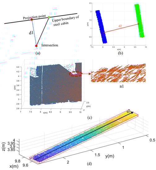 The extraction of the steel cabin: (a) example of the robust region-growing algorithm for SBG; (b) side surface; (c) top surface; and (d) top boundary and the line fitted by boundary points.