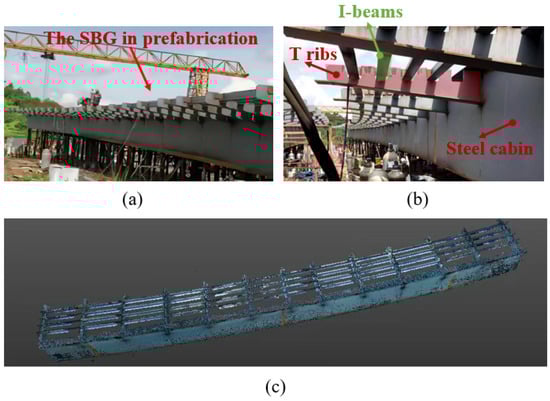 The SBG overview: (a,b) the SBG in prefabrication; (c) laser-scanned data for prefabricated SBG components.