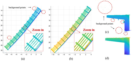 Experimental process for background points: top view of the scanned data of SBGs (a) before and (b) after applying the DBSCAN algorithm; side view of the scanned data of SBGs (c) before and (d) after applying the DBSCAN algorithm.