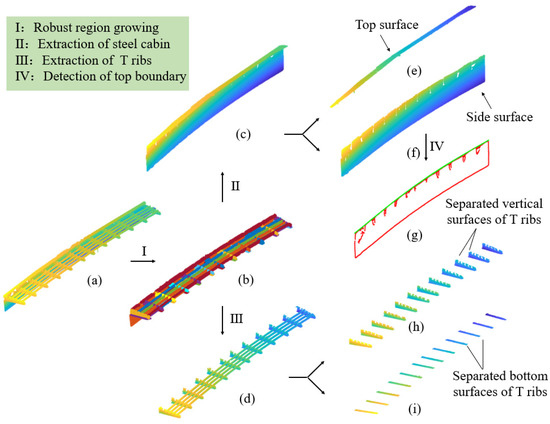 Experimental process for validation experiments: (a) preprocessed point clouds of SBGs; (b) laser-scanned data cluster classification; (c) extracted steel cabin; (d) T ribs after the application of the subtraction algorithm; (e) top surface of the steel cabin; (f) side surface of the steel cabin; (g) upper boundary of the steel cabin; (h) vertical planes of the T ribs; and (i) bottom planes of the T ribs.