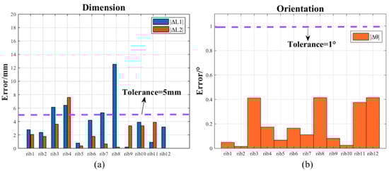 Table 3 presents the location deviations of the T ribs calculated with the proposed method. L1 is the distance from the intersection point to the upper boundary, as illustrated in Figure 11a, and L1′ is the distance measured manually. L2 is the distance between adjacent T ribs calculated by the proposed method, and L2′ is the distance measured manually. Figure 14a shows the error analysis histogram for the T rib positions; the maximum and minimum absolute differences were 12.5 mm and 0.2 mm, respectively, and the RMSE was 4.7 mm. Note that, in this case, the number of measurements (‘n’ in the RMSE formula) was 24. An average dimension estimation error of 2.4 mm was obtained, which was within the specified tolerance of 5 mm. Therefore, the proposed geometric quality assessment method could measure the location of the T ribs with sufficient accuracy.
