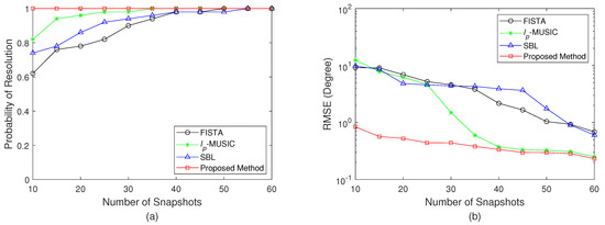 where K represents the number of the Monte Carlo runs, represents the real DOA of the q-th signal, and represents the estimate to in the k-th Monte Carlo run. The -MUSIC, the FISTA-based method in [27], and the SBL-based method in [21] are performed for comparison. For -MUSIC, as recommended in [8], is employed.