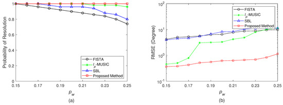In the following two experiments, the SNR and SOR of each algorithm are fixed at 20 dB and −20 dB, whereas is set at 0.15 for the former experiment and the number of snapshots for the latter experiment is . Figure 2 and Figure 3 show the performance of the algorithms as a function of the number of the data samples and , respectively. As Figure 2 and Figure 3 indicate, the proposed method presents a more robust performance over the other three methods when few snapshots are available or when increases, which indicates a higher occurrence probability of outliers.