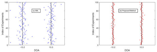 In the last experiment, we assume that there are two coherent signals impinging on the array. The SNR and SOR are set at 20 dB and −20 dB, respectively. is set at 0.2. The number of snapshots is . Figure 4 shows 100 realizations of the DOA estimates of these four algorithms. As shown in Figure 4, the DOA estimation results of the -MUSIC [8], the FISTA-based method [27] and the SBL-based method [21] present a fairly large deviation with the real DOAs in the realizations, and the proposed method gains a much more accurate DOA estimation. This also proves that our proposed method is not only robust for uncorrelated signals but also for coherent signals.
