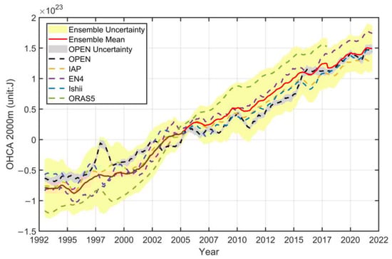 Time series of monthly global OHC anomalies for 0–2000 m over the January 1993– December 2021 period (unit: J). Ensemble mean (solid red) is represented by the mean value of the OPEN (dashed black), IAP (dashed yellow), EN4 (dashed purple), Ishii (dashed blue), and ORAS5 (dashed green) datasets. The yellow shade corresponds to double standard deviation for the ensemble and the grey shade corresponds to double standard deviation for the OPEN dataset. A 12 month running mean is used to filter high frequency signals. The reference period for OHC anomalies is 1993–2015 for all the datasets.