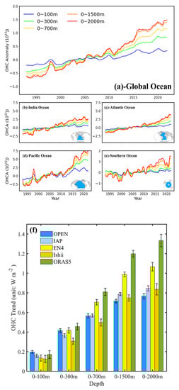Time series of monthly OPEN OHC anomalies integrated from surface to different depths over the period of 1993–2021 in (a) the global ocean, (b) the Indian Ocean, (c) the Atlantic Ocean, (d) the Pacific Ocean, and (e) the Southern Ocean. The colored lines indicate the OHC on the left axis (unit: 10^22 J). The blue area in the inset map indicates the division of the globe into the Indian, Atlantic, Pacific, and Southern Oceans. (f) Global OHC trends for different depth ranges (0–100 m, 0–300 m, 0–700 m, 0–1500 m, and 0–2000 m) for the period of 1993–2021 by the five datasets (unit: W m−2), with error bar by two times standard deviations. The reference period for OHC anomalies is 1993–2015 for all the datasets.