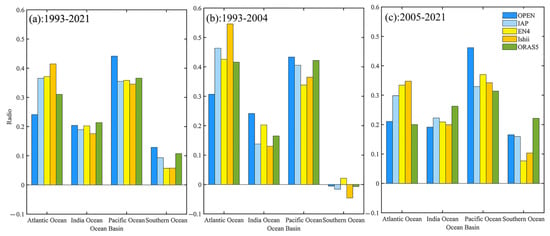 Moreover, as shown in Figure 2, the heat uptake by the Atlantic and Pacific Oceans is more pronounced than the other ocean basins, which indicates that the Pacific and Atlantic Oceans dominate heat uptake in the global ocean. Several previous studies have analyzed the contribution of different ocean basins to global ocean heat absorption [35,36,40]. Therefore, we calculated the ratio of OHC of the four basins to the global ocean to quantitatively analyze their contributions to ocean heat uptake over the different periods. We divided the period from 1993 to 2021 (Figure 3a) into two periods: the pre-Argo era from 1993 to 2004 (Figure 3b) and the Argo era from 2005 to 2021 (Figure 3c). During the 1993–2021 period, all five datasets show the overall dominance of heat absorption in the Pacific and Atlantic oceans (Figure 3). During the period from 1993 to 2004, the five datasets show that the Atlantic Ocean and the Pacific Ocean dominated the global heat absorption, while the Southern Ocean showed a slightly negative contribution. Meanwhile, the contribution of the Indian and Southern Oceans to global heat absorption has increased in recent decades (Figure 3c). The contribution ratios obtained from different datasets are generally consistent, despite there being some discrepancies. Different from other datasets, the OPEN and ORAS5 datasets demonstrate that the Pacific Ocean and the Atlantic Ocean play dominant roles in the heat uptake of the global ocean during 1993–2021. Specifically, the heat absorption contribution of the Pacific Ocean is greater than that of the Atlantic Ocean, while other datasets show similar heat absorption contributions from the Pacific and Atlantic Oceans during 2005–2021.
