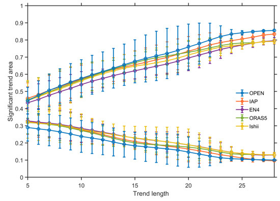 As shown in Figure 6, with the increase of the step size, the statistically significant positive trend area in the global ocean increases, and the statistically significant negative trend area decreases with trend length, indicating that global ocean warming was unabated. This conclusion is consistent with the previous study by Johnson et al. [20]. Taking the OPEN dataset as an example, the average global warming area and global cooling area calculated based on the 5 year step linear fitting are 44.5% and 28.9%, respectively. Here, the area of the global OHC trend that passes the significance test is relatively small, as the degrees of freedom obtained by sliding over a 5 year time step are as low as 5.8. Therefore, as the time step increases, the global ocean area passing the significance test gradually increases. The error bars in Figure 6 are represented by 95% confidence intervals, i.e., two times standard deviation of the ensemble of linear trends with time steps ranging from 5 to 29 years of the OPEN dataset. When the time step is 15 to 20 years, the results are more uncertain. By comparing the global warming area ratio of the five datasets, the result of the OPEN dataset is very close to those of the other three datasets, except the EN4 dataset which shows a relatively small proportion of the global warming area. After the time step reaches 20 years, the result of the OPEN dataset is slightly larger than the other datasets. Until the time step reaches 25 years, the OPEN dataset result is closest to the result of the IAP dataset. At the same time, in the statistics of the proportion of global cooling area, the OPEN dataset shows a smaller global cooling area. As the time step increases, the difference among different datasets decreases, while the results of OPEN and IAP datasets are more similar, and the results of EN4 and Ishii datasets are closer.