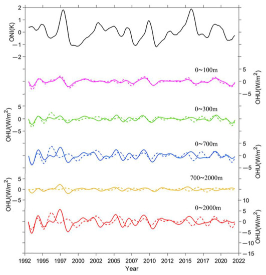 The global ocean starts to lose heat at the onset of an El Niño event, and OHU also reaches a minimum after the peak of the El Niño event. Consistent with the previous studies (e.g., [25,26]), considering the two intense El Niño events in 1997/1998 and 2015/2016 as examples, the 0–100 m and 0–2000 m results in Figure 7 and Figure 9 show strong warming signals before the El Niño event. The OHU result also offers a more apparent downward trend after the El Niño event due to its energy release into the atmosphere. This may be related to the active vertical heat redistribution in the upper ocean during ENSO events. It’s worth noting that the OPEN dataset not only shows a strong ENSO signal in the 0–100 m upper ocean, but also shows an obvious bump of OHC anomaly in the subsurface and deeper ocean. Further investigation is needed to understand the mechanisms and causes of this phenomenon.