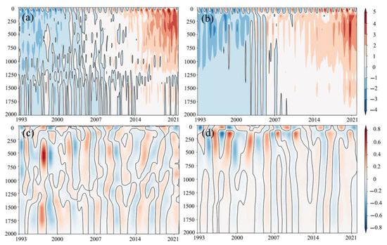 To more intuitively investigate the vertical distribution of global OHC over the past three decades, we plotted the depth-time map of OHC and OHU at a global scale (Figure 8). From 1993 to 2021, the OHC for both the OPEN and IAP datasets show an increasing trend over time in different ocean layers from a vertical profile perspective, and the heat significantly transfers from surface to subsurface and deeper layers (Figure 8a,b), verifying the conclusion in Figure 1 and Figure 2 that the oceans absorb most of the global warming heat and gradually transport deeper into the ocean. Interannual variations of global OHC can be observed in the upper 100 m ocean, with obvious alternation of cold and warm signals.