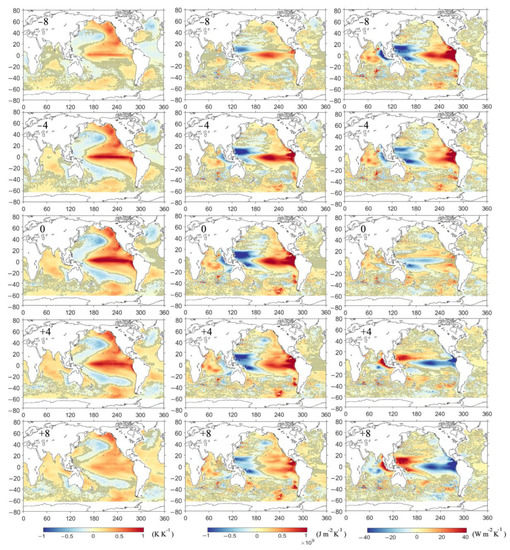However, the ocean OHC anomaly variability phenomenon for 0–2000 m during the ENSO event is more different from SST because the latter represents the sea surface information (Figure 10, middle column). In contrast, OHC is obtained by integrating subsurface and deeper temperatures inside the ocean with internal ocean signals. The spatial pattern changes in OHC anomalies mainly occur in the Pacific and Indian Oceans. With the development of the ENSO phenomenon (Figure 10, lag = −8, −4, 0, 4, and 8), the boundaries of cold and warm phenomena on the east and west sides of the central Pacific Ocean gradually shift westward during the zero-lag period, roughly on the exact boundary with SST at this moment. At the same time, the warming phenomenon in the eastern Pacific Ocean and the cooling phenomenon in the western Pacific Ocean show a strengthening and then weakening phenomenon. The contrast between the warming and cooling phenomena on the eastern and western sides of the Pacific Ocean is most evident during the zero-lag period, reaching a peak and extending to the southern and northern Pacific Ocean (Figure 10, middle column, lag = 0). During the ENSO phenomenon, the western Indian Ocean warms, and the eastern part cools with a clear reverse zonal gradient, which also peaks during the zero-lag period (Figure 10, middle column, lag = 0).
