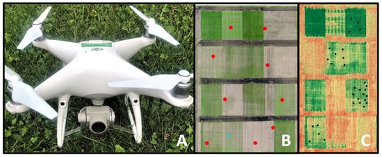 (A) The commercial off-the-shelf UAV used in this project was a DJI Phantom 4 Pro equipped with the DJI standard 1-inch 20-megapixel CMOS sensor. (B) An example of a final mosaicked RGB image. The red dots indicate the location of ground control points within the field. (C) An example of a modified greed red vegetation index (MGRVI) map generated in ArcGIS Pro. The black dots represent ground-truth sampling points. This field included cover crops beyond cereal rye, ground-truth samples were only collected from cereal rye monoculture plots.