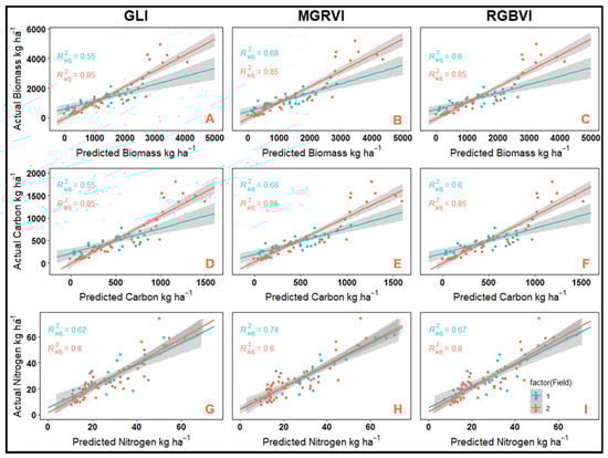 Correlation of in-field measured versus predicted values by field for cereal rye biomass, carbon, and nitrogen obtained from complex content-based models developed using green leaf index (GLI) (A—biomass, B—carbon, and C—nitrogen), modified green red vegetation index (D—biomass, E—carbon, and F—nitrogen), and red green blue vegetation index (G—biomass, H—carbon, and I—nitrogen).