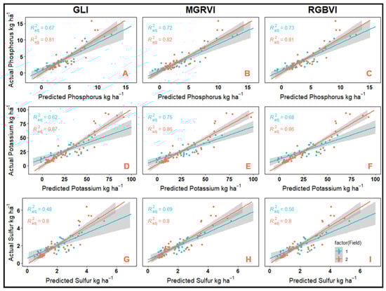 Correlation of in-field measured versus predicted values by field for cereal rye phosphorus, potassium, and sulfur obtained from complex content-based models developed using green leaf index (GLI) (A—phosphorus, B—potassium, and C—sulfur), modified green red vegetation index (D—phosphorus, E—potassium, and F—sulfur), and red green blue vegetation index (G—phosphorus, H—potassium, and I—sulfur).