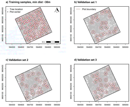 Randomly spaced 0.10 ha circulate plots for remote sensing-based α-diversity model (a) training and separate (b), (c,d) model validation sample data with a minimum distance of 30 m apart at plot center. Three separate iterations were used to select random validation samples while reducing spatial alignment with training sample data.