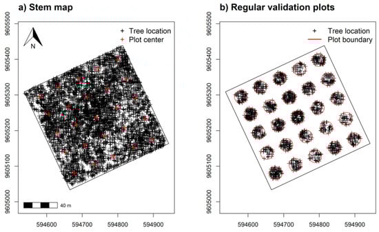 Stem mapped tree species ≥5 cm DBH from (a) across the sampling area and (b) within simulated 0.10 ha validation plots regularly spaced at 60 m apart for assessing α-diversity model predictions. Tree location UTM coordinates in (a) with height and elevation measurements were also used to develop tree canopy height and elevation models.