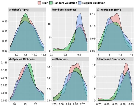 Model training and validation data density distributions from simulated random and regularly spaced 0.10 ha validation plots and values for (a) Fisher’s alpha, (b) Piélou’s evenness, (c) inverse Simpson’s, (d) species richness, (e) Shannon’s H′, and (f) unbiased Simpson’s on the x-axis.