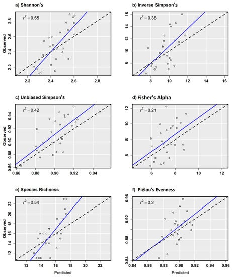 Observed versus predicted diversity index values for 0.10 ha random validation plots from the combined ensemble models using Sentienl-2, RapidEye, and canopy height and topography predictor variables.