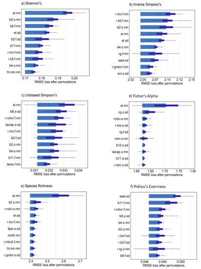 Spatial predictions from the different sensor models showed higher α-diversity values in the upper (northern) half of the 9 ha study area (Figure 8a–c). Combined, Sentinel-2 and RapidEye models were in general agreement in terms of locations showing high and low α-diversity. RapidEye imagery with higher spatial resolution (5 m pixels) showed more discrete differences between areas of high and low diversity. The larger pixel size from Sentinel-2 imagery (10–20 m) rendered a more generalized map of high and low tree diversity that was relatively consistent with diversity measures mapped using RapidEye. Combined sensor model predictions varied in appearance, which was likely dependent on variables selected from individual sensors that contributed most to each prediction. Variable importance measures from combined models indicated that, overall, elevation values were most important to α-diversity predictions (Figure 9a–f). Somewhat unexpectedly, canopy height was not among the top 10 predictor variables for most diversity measures, likely in part because average tree height was positively correlated with elevation (r = 0.54) in the study area. In contrast, mean, maximum and minimum canopy height predictors were among the top 10 variables selected with RFE for species richness, in addition to elevation mean and standard deviation (data not shown). Variable importance measures further indicated that a mixture of bands and VI from the two sensors and seasonal dates were helpful for making accurate predictions (Figure 9a–f). This was clear from combined models where the Sentinel-2 chlorophyl absorption band 2 in the blue light spectrum from the leaf-on period was among the most important variables for Shannon’s H′, Inverse Simpson’s, Unbiased Simpson’s, and species richness predictions. Mean and standard deviation values from red, red-edge and NIR bands from both sensors were alternately important for diversity measures with an exception of Fisher’s Alpha showing elevation as strongly important (Figure 9d). We did not interpret predictors for evenness because of relatively low model performance.