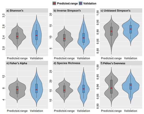 Observed α-diversity index values compared with the range of predicted pixel values from the combined spatial model for regularly spaced 0.10 ha validation plots.
