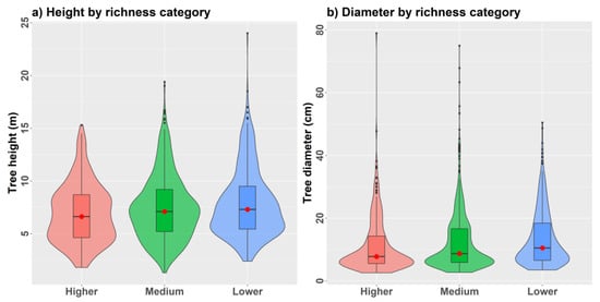 Violin plots of (a) tree height and (b) tree diameter distributions comparing regularly spaced 0.10 ha validation plots (n = 25) grouped by lower (<15), medium (15 to 19), and higher (≥20) species richness.